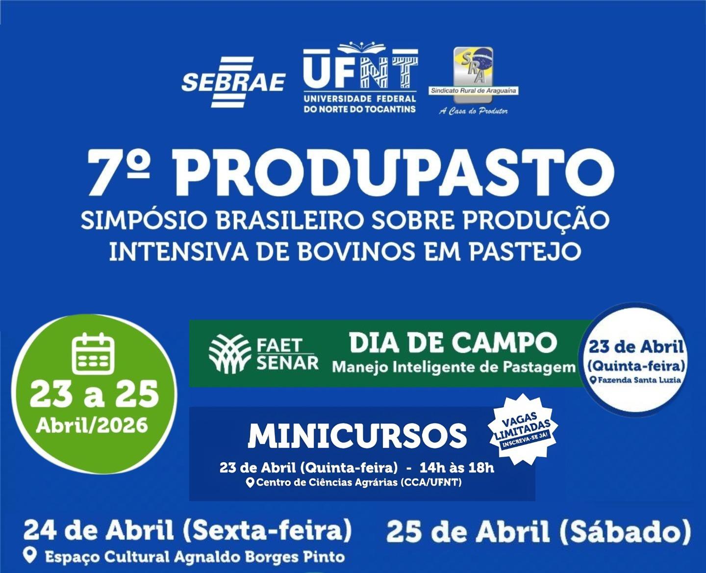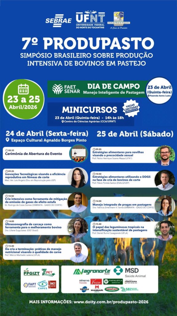 Araguaína sediará, entre os dias 23 e 25 de abril de 2026, a 7ª edição do Produpasto, Simpósio Brasileiro sobre Produção Intensiva de Bovinos em Pastejo, um dos principais encontros técnicos voltados à bovinocultura na região Norte do país.