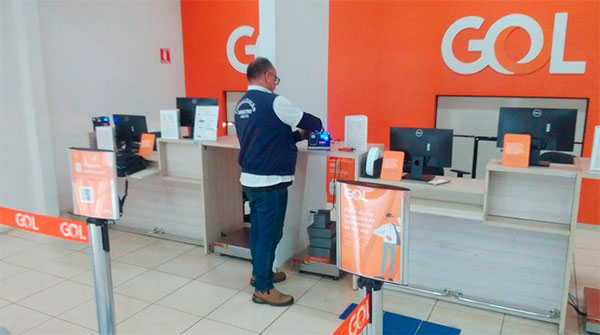 No local, os agentes metrológicos realizaram a Verificação Periódica nas quatro balanças de pesagem que ficam nos guichês de despacho de bagagens da companhia aérea.
