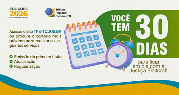 Faltam apenas 30 dias para o fechamento do cadastro eleitoral, e a Justiça Eleitoral do Tocantins faz um alerta importante às eleitoras e aos eleitores. Até o dia 6 de maio, ainda é possível tirar o título de eleitor, atualizar dados, transferir o domicílio eleitoral ou regularizar pendências para participar das Eleições Gerais de 2026.