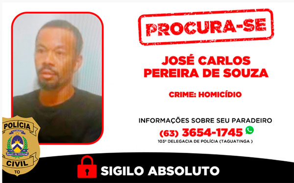 A Polícia Civil do Tocantins está à procura de José Carlos Pereira de Souza, de 39 anos, suspeito de envolvimento em um crime de homicídio que vitimou Gildomar da Silva Oliveira, de 37 anos, ocorrido em Taguatinga, região sudeste do Estado. O homem está com prisão preventiva decretada pela Justiça e, até o momento, segue foragido.