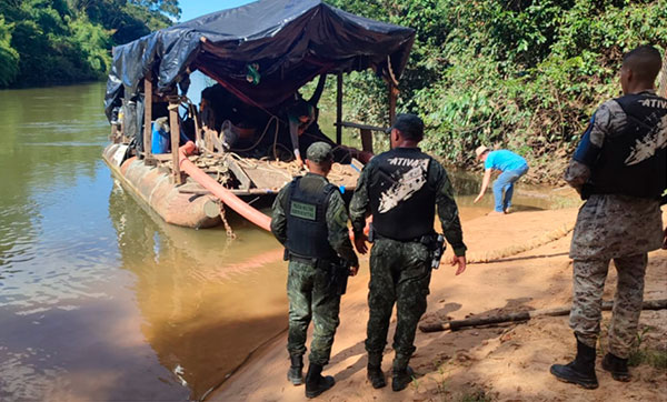 Ao chegarem ao local indicado, as guarnições confirmaram a existência de uma estrutura de garimpo clandestino operando diretamente no leito do rio, caracterizando intervenção irregular em Área de Preservação Permanente (APP). Foram identificadas duas balsas mineradoras (dragas) e sistemas de sucção destinados ao beneficiamento de ouro.
