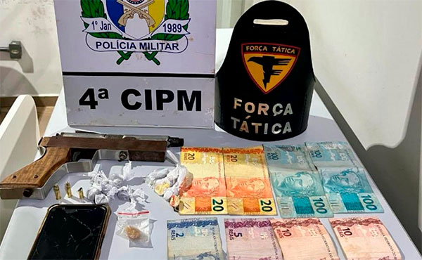 Junto aos entorpecentes e à arma, foram apreendidos R$ 267,00 em espécie e três cápsulas de munição.